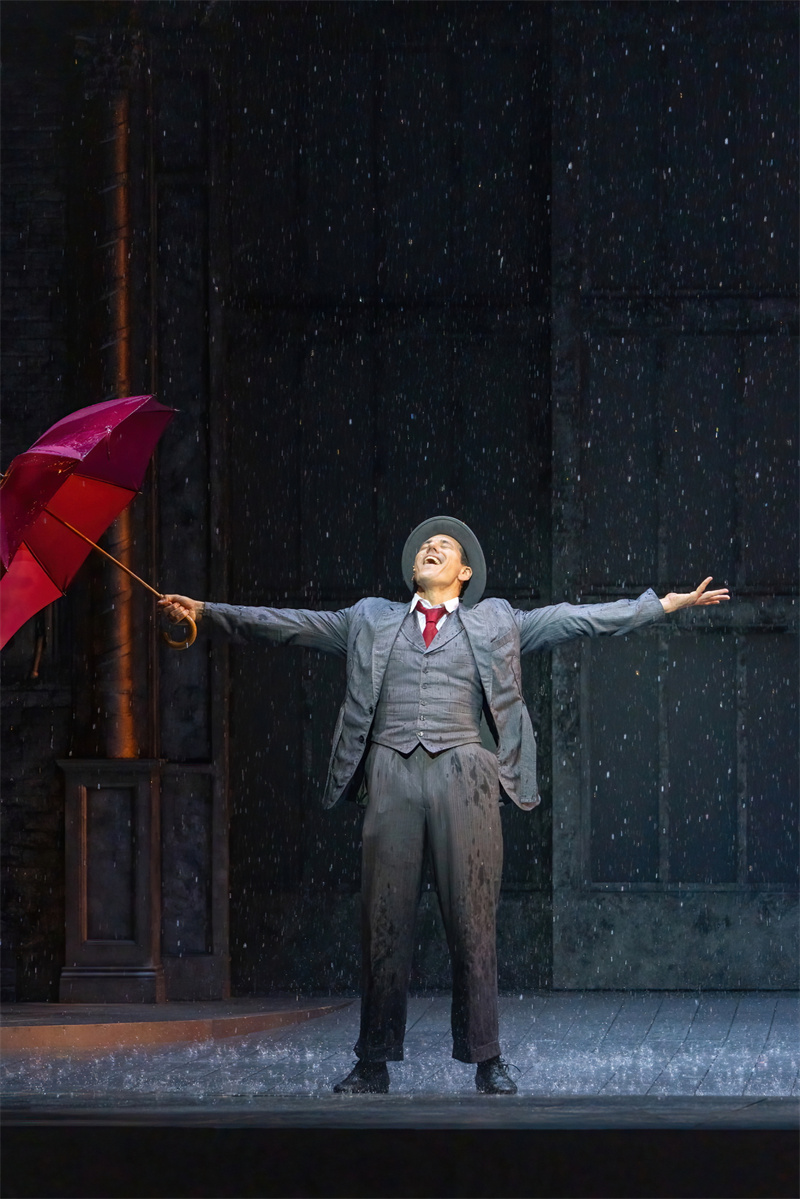 在舞台上,音乐剧完美还原了电影中的经典唱段,包括《早安》(Good Morning)、《逗他们笑》(Make‘em Laugh)、《摩西假设》(Moses Supposes)和传唱度极高的曲目《雨中曲》(Singin’in the Rain)。特别是《雨中曲》段落,六吨水倾泻而下,通过高科技喷淋设备,在舞台上打造出独一无二震撼雨幕,格兰特·阿米拉尔在雨中打着伞欢唱,复刻电影中的名场面,再现一代人儿时关于“雨中曲”的经典回忆?!队曛星泛铣方诟墙殖∑胀葡蛄烁叱?,水花飞溅,观众随着音乐的节奏共同欢唱,气氛热烈,成为整部音乐剧的亮点之一。