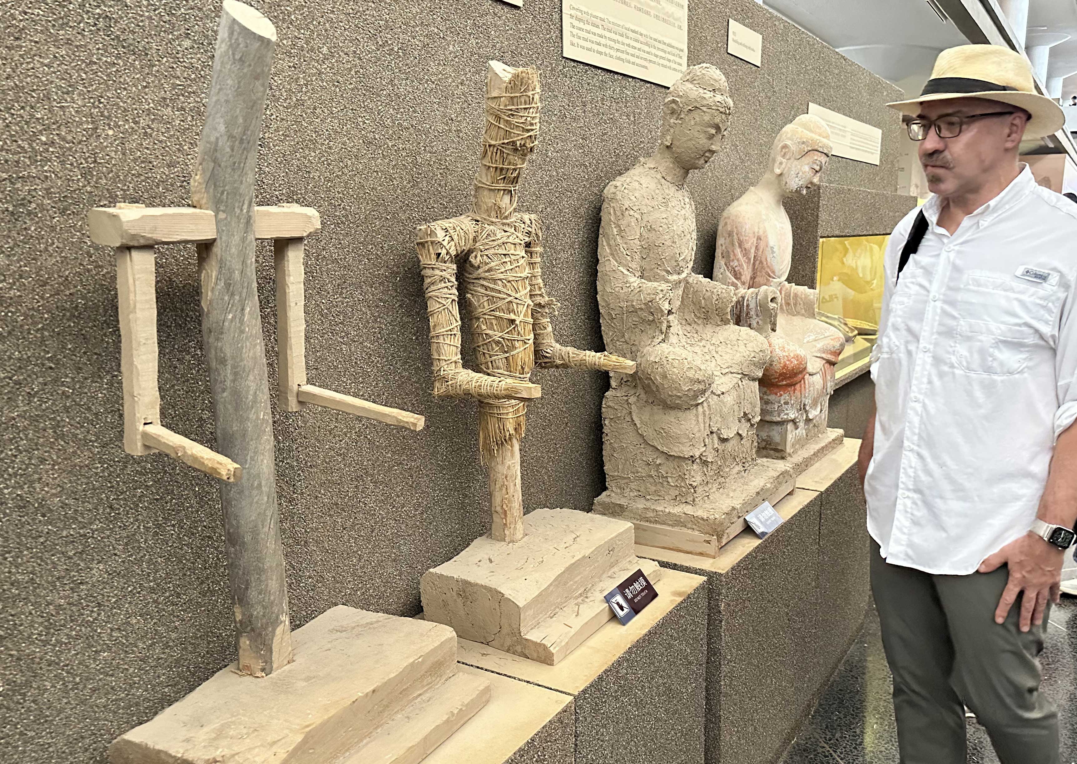 2025年8月8日,史瀚文在敦煌石窟文物保护研究陈列中心研究彩塑的制作过程。中新社记者 冯志军 摄