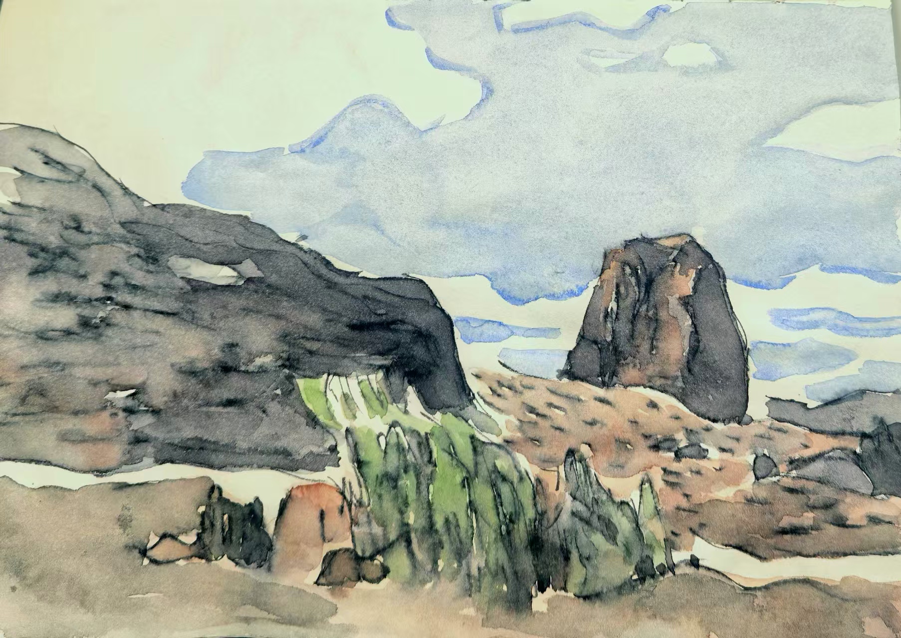70余岁的中央美院教授崔晓东老师被贺兰山的壮美震撼,他用最质朴的笔触表达最深切感受,面对大山,一坐就是数小时。他说,在贺兰山的怀抱中,可以感受到一股的强大力量与无穷魅力。